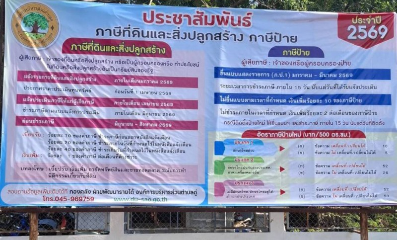 หัวข้อ :: งานจัดเก็บองค์การบริหารส่วนตำบลดู่ ประชาสัมพันธ์ ภาษีที่ดินและสิ่งปลูกสร้าง ภาษีป้าย ประจำปีงบประมาณ 2569